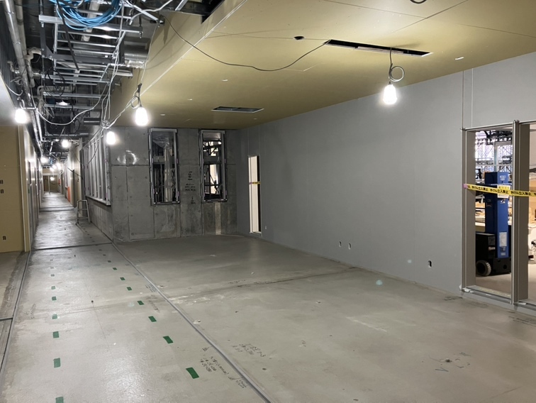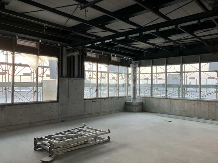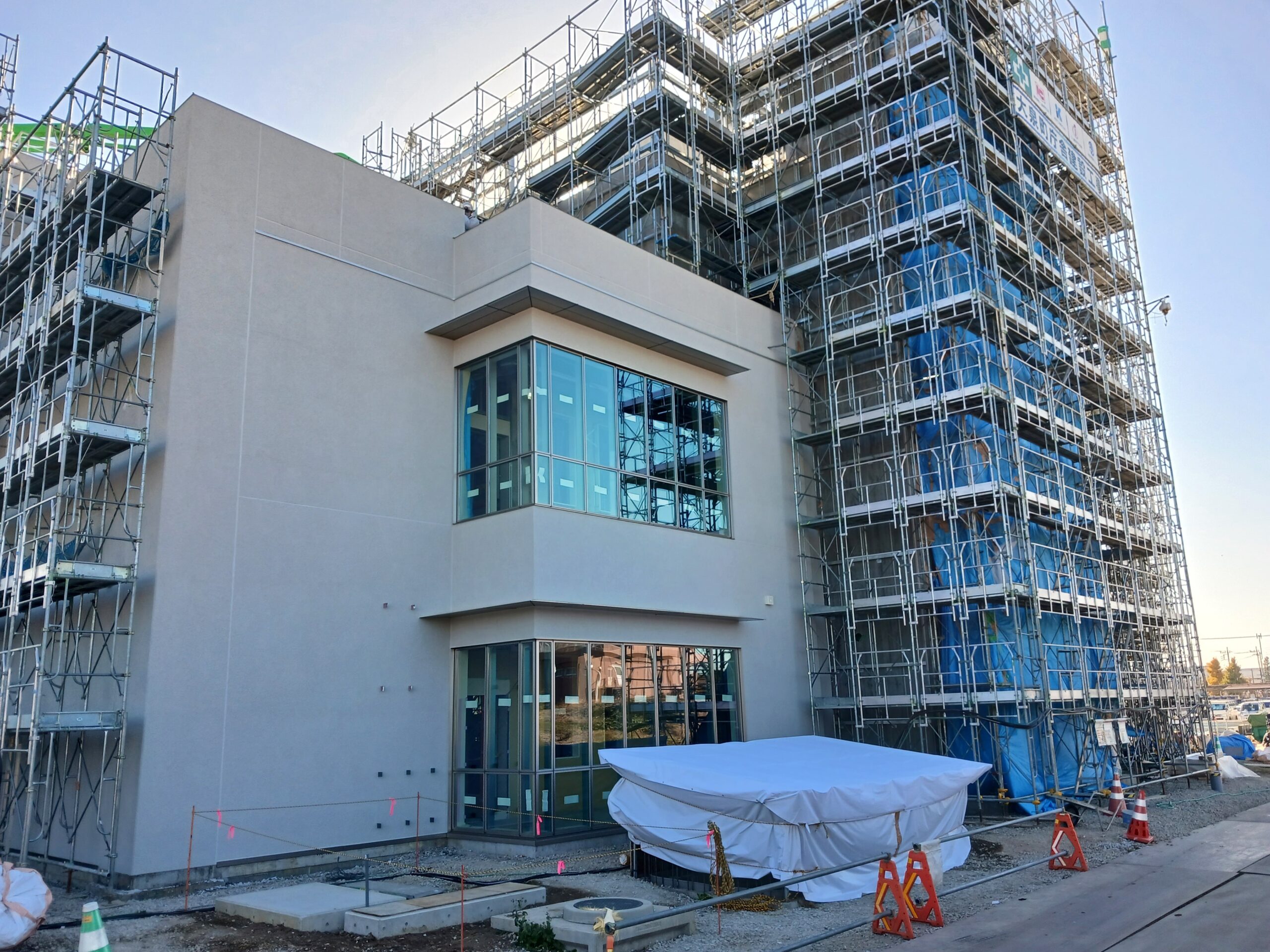外壁(西面)の工事を進めています。「Low-Eガラス」と呼ばれる、断熱性や遮熱性能の高いガラスを使用することで環境に配慮しています。