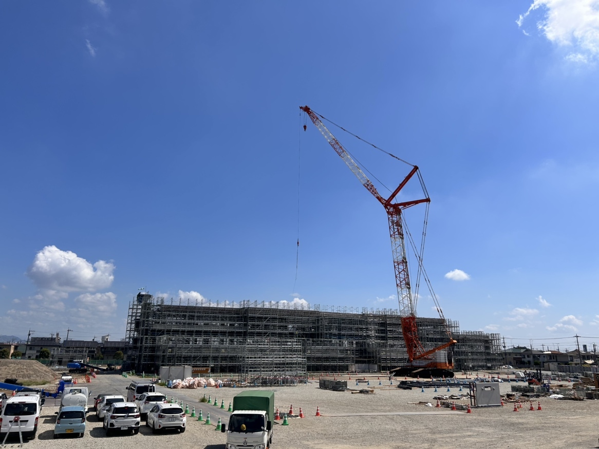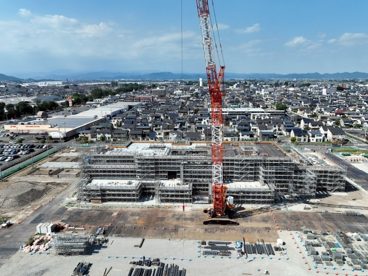 上階へと工事が進み、屋上部分の工事に着手しています。太陽光発電設備などを設置するための土台を整備しています。